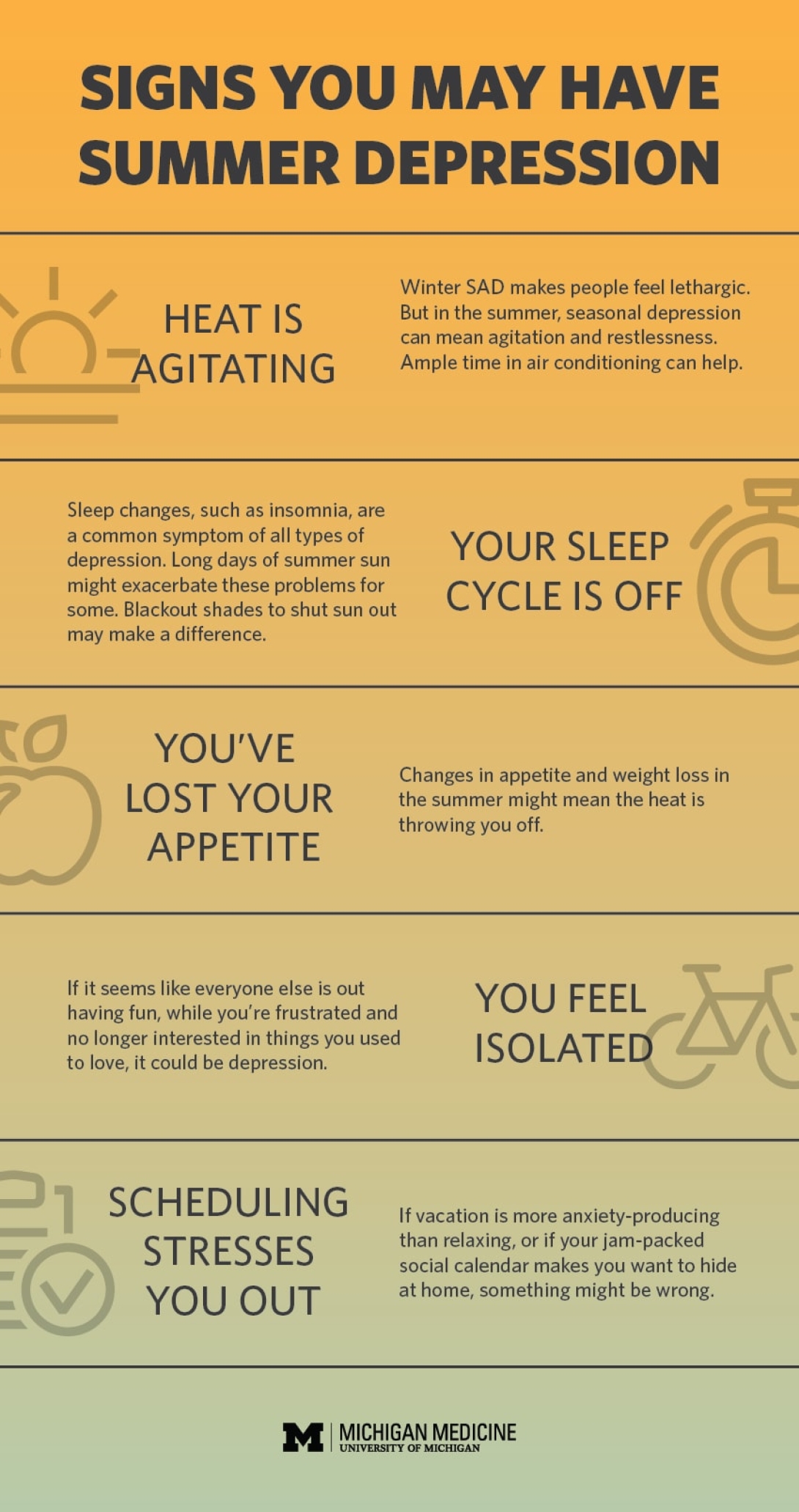 "Having seasonal depression in the summer is not as common as wintertime depression, but mental health professionals do see it," Michelle Riba, M.D., a clinical professor of psychiatry at the University of Michigan and associate director of the U-M Depression Center, said last year.