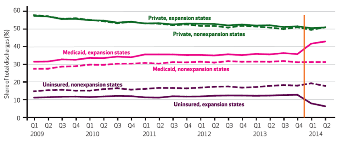 This is likely, they say, because those who were uninsured before 2014 and became sick enough to need hospital care in the first half of that year were likely to have been lower-income people who qualified for Medicaid under the new expanded criteria.