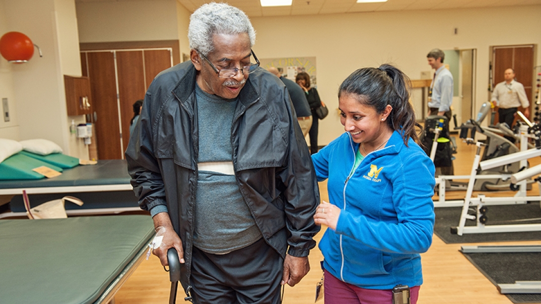 "Stroke patients will have some natural recovery without rehab, but there is quite a bit of evidence that formal rehabilitation helps patients recover faster and better than they would otherwise," says Edward S. Claflin, M.D., (pictured above with a patient) an assistant professor in physical medicine and rehabilitation at the University of Michigan Medical School.