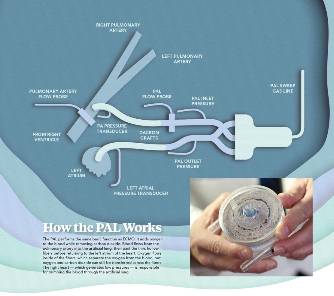 The PAL, which is about the size of an adult's hand and is made of hollow fiber membranes, performs the same basic function as ECMO: it adds oxygen to the blood while removing carbon dioxide.