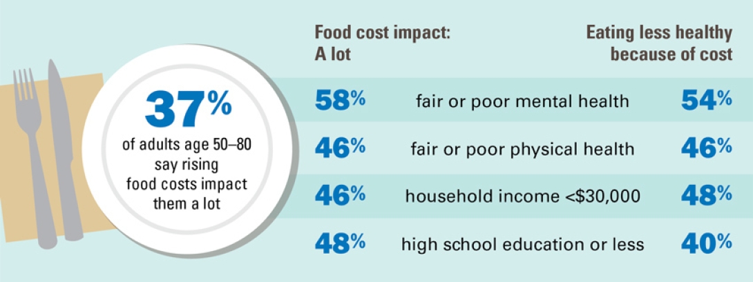 The pinch of inflation is having a direct impact on what foods older adults are buying. More than a third (36%) of those age 50 to 64 said their diet is less healthy because of rising costs, compared with 24% of those age 65 to 80.