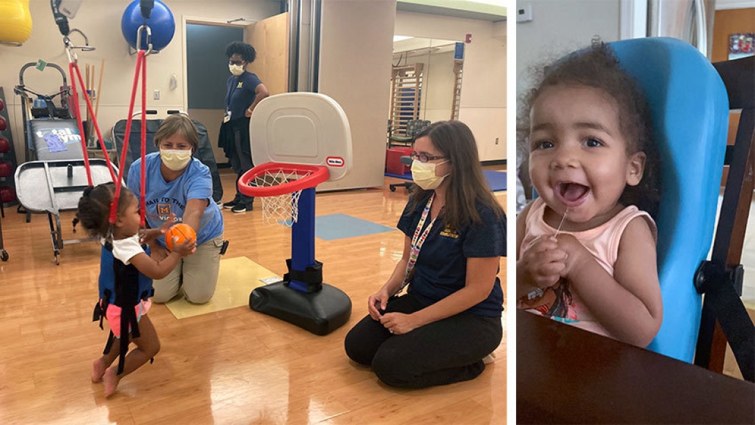 Within weeks after treatment, Harley Barnes made slow improvements. She worked consistently with Betsy Howell, P.T., her physical therapist at the U-M Health Pediatric Rehabilitation Center. Harley went from not being able to lift her arms and legs to being able to feed herself and operate a manual wheelchair.